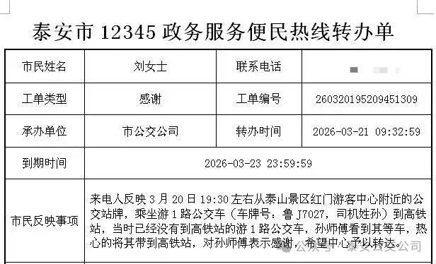 近日,泰安市12345政務服務便民熱線收到乘客劉女士的感謝工單,專門致謝市公交公司游1路駕駛員孫寧超的暖心舉動,其用平凡小事彰顯了公交人的責任與擔當。