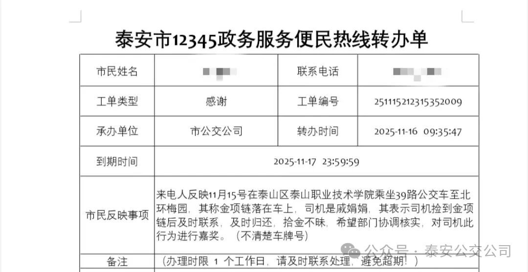 2025年11月16日,泰安市民趙女士通過(guò)泰安市12345政務(wù)服務(wù)熱線(xiàn),向39路公交車(chē)駕駛員戚娟娟致以誠摯感謝,為其拾金不昧的暖心舉動(dòng)點(diǎn)贊。