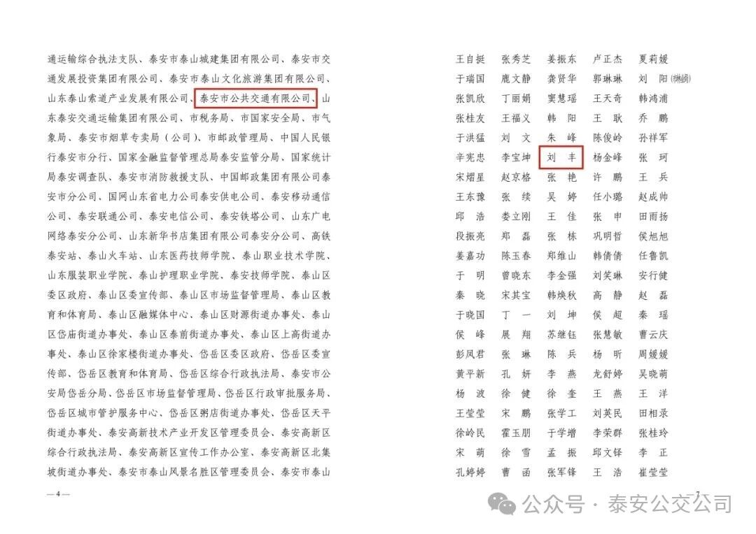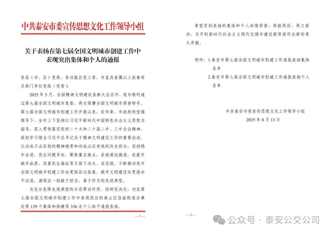 近日,中共泰安市委宣傳思想文化工作領(lǐng)導(dǎo)小組印發(fā)《關(guān)于表揚(yáng)在第七屆全國(guó)文明城市創(chuàng)建工作中表現(xiàn)突出集體和個(gè)人的通報(bào)》,泰安市公共交通有限公司憑借在第七屆全國(guó)文明城市創(chuàng)建工作中的優(yōu)異表現(xiàn)和積極貢獻(xiàn),榮獲“第七屆全國(guó)文明城市創(chuàng)建工作表現(xiàn)突出集體”,黨群與人力資源部劉豐榮獲“第七屆全國(guó)文明城市創(chuàng)建工作表現(xiàn)突出個(gè)人”。