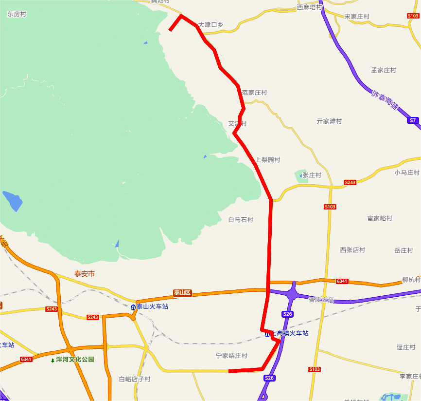 優(yōu)化調整后30路首末站變?yōu)樯硯X石敢當小鎮(zhèn)和山東農(nóng)業(yè)大學泮河校區(qū)。運行路線為沙嶺石敢當小鎮(zhèn)—開明路—大津口鄉(xiāng)—泰明路—天燭峰路—靈山大街—上高東路—泮河大街—山東農(nóng)業(yè)大學泮河校區(qū);山東農(nóng)業(yè)大學泮河校區(qū)—泮河大街—上高東路—靈山大街—天燭峰路—泰明路—大津口鄉(xiāng)—開明路—沙嶺石敢當小鎮(zhèn)。優(yōu)化調整后運行路線圖如下: